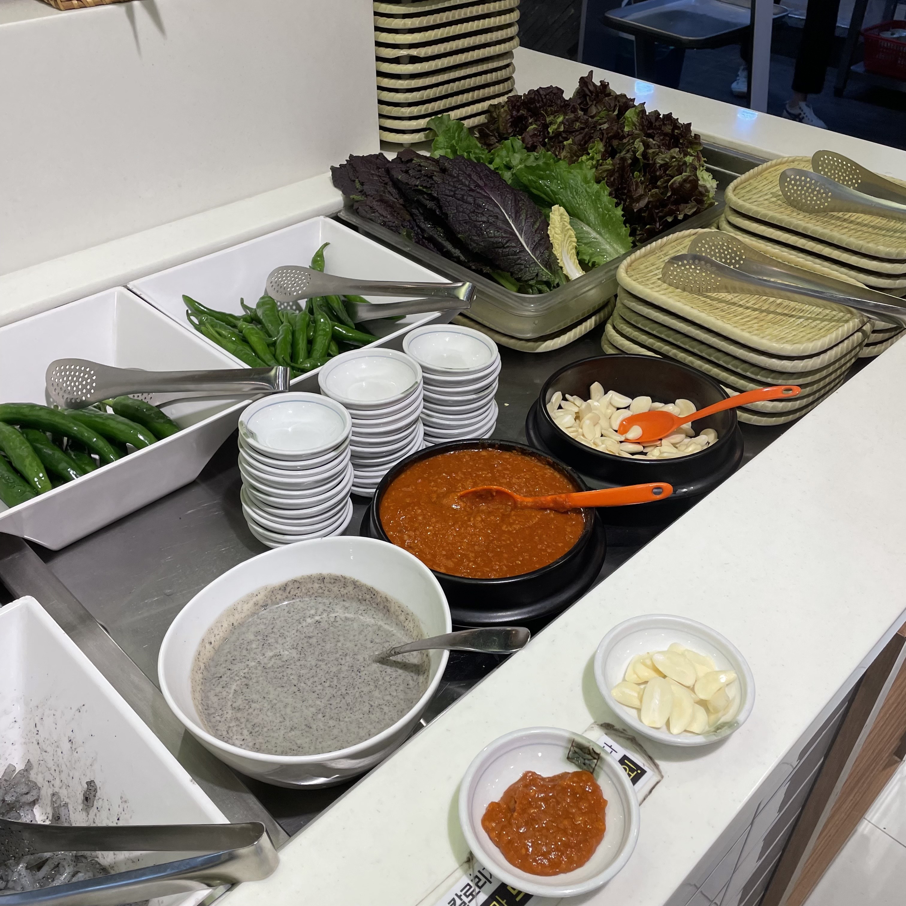 맷돌36 숯불갈비는 기본반찬과 음료수, 디저트 등 이 셀프바 형식으로 되어있다~!