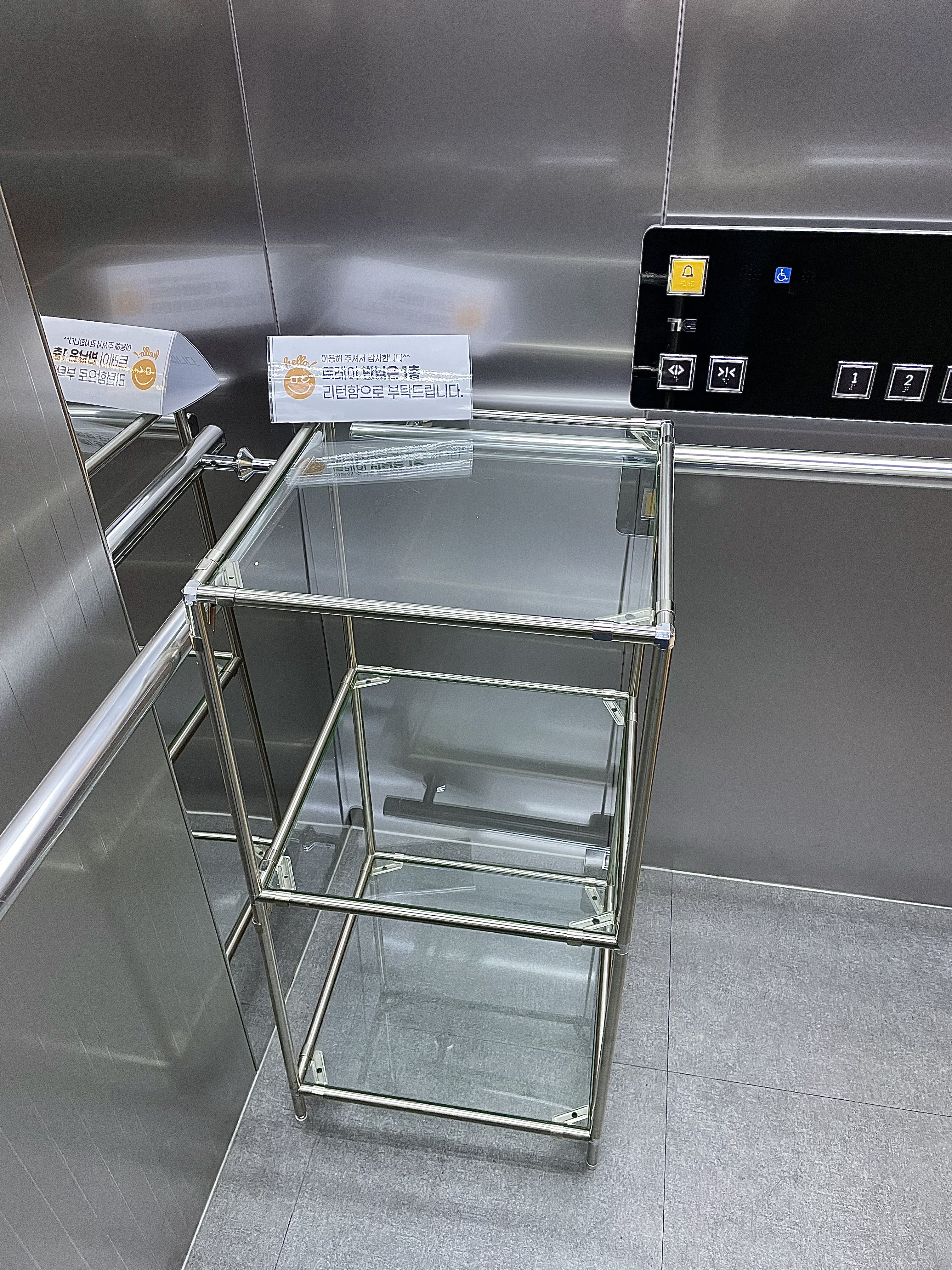 엘리베이터 안에 친절하게 트레이를 놓을 수 있는 선반도 있다~ 센스있어!ㅋㅋ