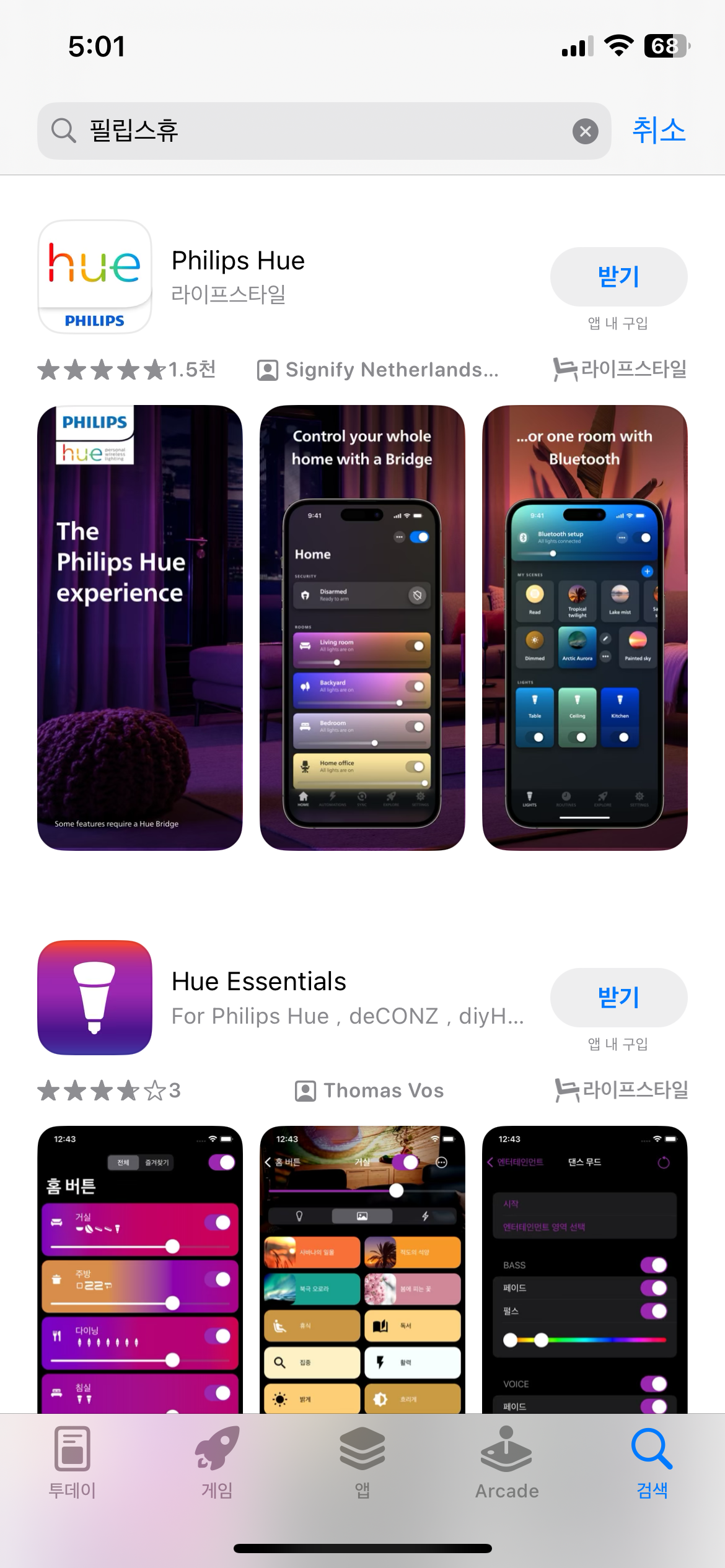 조명을 돌려 끼워주고, 필립스 휴 어플을 다운받는다!그리고 블루투스로 연결만 해주면 끝!!! 너무 간단해서 놀랬다!조명도 진짜 다양하게 원하는 컬러로 설정이 가능하다.