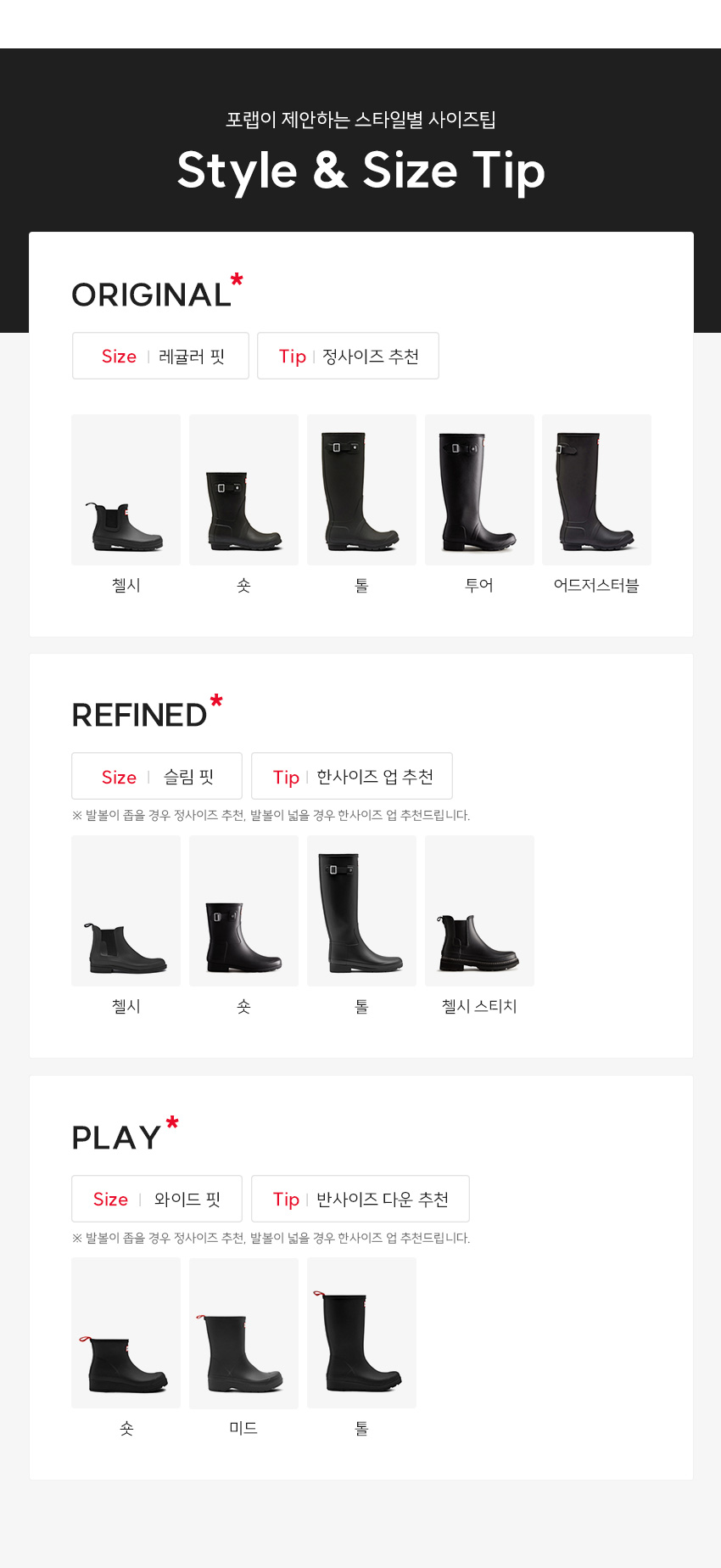 헌터 공홈에 나와있는 부츠별 핏과 사이즈 비교해둔 이미지다.